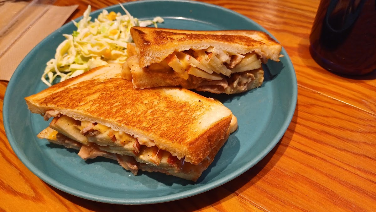 One of the highlights of the menu includes the #1 WNC Sandwich, a creative combination of succulent pork sautéed to perfection, paired with the refreshing zest of orange, a touch of arugula, and layers of rich cheddar and Gouda cheese. This sandwich is a symphony of flavors, with the slight bitterness of arugula acting as the perfect counterpoint to the sweetness of the orange. For just JP¥1,350, you can elevate your meal by adding crispy French fries or a small dessert for a mere JP¥300 more, transforming it into a delightful dining experience.